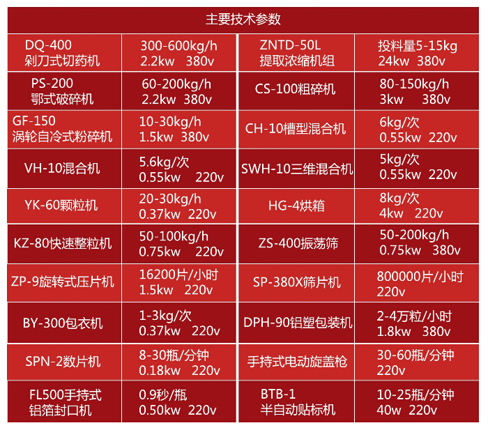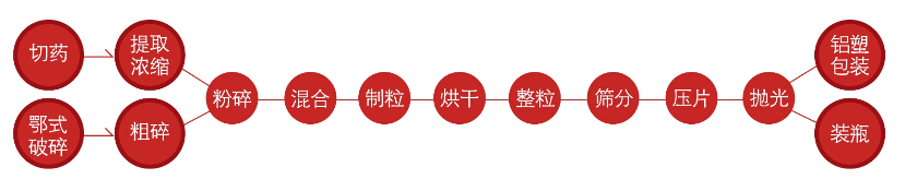 首先用切藥機(jī)將物料切成片或段,然后使用提取濃縮機(jī)組得到濃縮物;物料也可以首先經(jīng)過PS鄂式破碎機(jī)進(jìn)行破碎后,再用CS100粗碎機(jī),將大塊物料粗碎,然后進(jìn)行粉碎;粉碎機(jī)可選擇GF-150渦輪自冷式粉碎機(jī)或SF-130中藥高速粉碎機(jī),物料細(xì)度100-120目之間。粉碎后,將多種物料倒入CH-10混合機(jī)內(nèi),混合均勻。CH-10混合機(jī)適合干粉和濕粉混合,按工藝要求,使用VH-10或SWH-10混合機(jī)進(jìn)行總混。YK-60顆粒機(jī)把總混后的物料制成11目—14目的顆粒。然后采用HG-4或HG-6烘箱,把物料烘干。烘干后有些物料會結(jié)塊,使用KZ-80快速整粒機(jī)將物料快速還原成顆粒,而不破壞其顆粒形態(tài)。ZS-400振蕩篩將不同目數(shù)的顆粒和粉末篩分,保證壓片物料質(zhì)量。壓片機(jī)可選擇ZP-9旋轉(zhuǎn)式壓片機(jī)或TDP單沖壓片機(jī)系列。壓片時,最好將物料配比,11目—14目的顆粒占30%,60目-80目粉末占70%,如此配比,物料流動性好,壓制成形的片重一致。片劑壓制出來后,用SP-380X篩片機(jī)拋光,去除毛刺和粉塵。之后,可選擇BY-300糖衣機(jī)包糖衣或包薄膜衣。