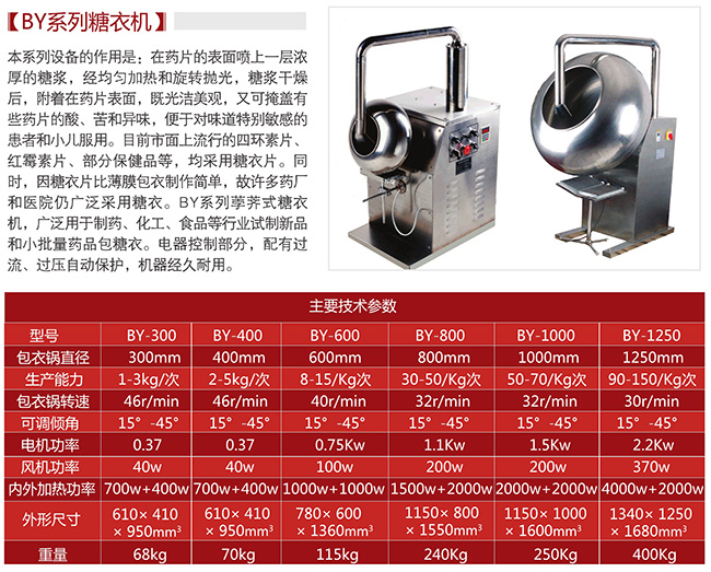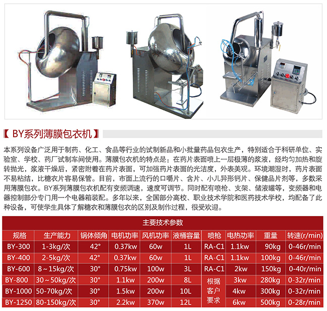 BY系列荸薺式糖衣機,廣泛用于制藥、化工、食品等行業(yè)試制新品和小批量藥品包糖衣生產(chǎn)。電器控制部分,配有過流、過壓自動保護,機器經(jīng)久耐用。