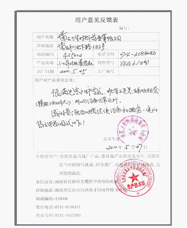 2010年5月25日,湖北黃石衛(wèi)生材料藥業(yè)有限公司向我廠購(gòu)買一臺(tái)8頭風(fēng)油精灌裝機(jī),為趕貨24小時(shí)運(yùn)行,效果穩(wěn)定,速度為96瓶/分鐘,下面是湖北黃石衛(wèi)生材料藥業(yè)有限公司對(duì)該機(jī)的調(diào)試驗(yàn)收單。