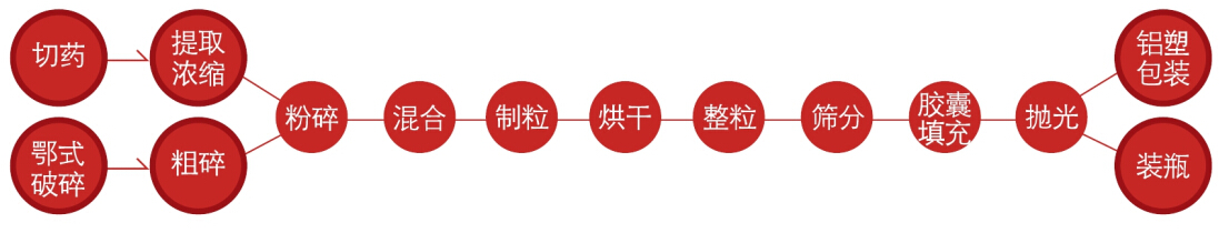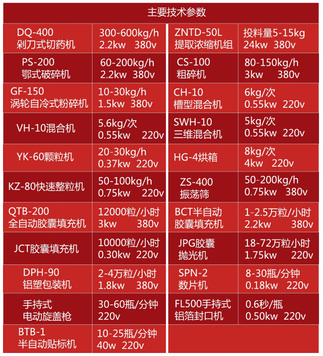 生產(chǎn)流程介紹:首先用切藥機(jī)將物料切成片或段,然后使用提取濃縮機(jī)組得到濃縮物;物料也可以首先經(jīng)過PS鄂式破碎機(jī)進(jìn)行破碎后,再用CS100粗碎機(jī),將大塊物料粗碎,然后進(jìn)行粉碎;粉碎機(jī)可選擇GF-150渦輪自冷式粉碎機(jī)或SF-130中藥高速粉碎機(jī),物料細(xì)度100-120目之間。粉碎后,將多種物料倒入CH-10混合機(jī)內(nèi),混合均勻。CH-10混合機(jī)適合干粉和濕粉混合,按工藝要求,使用VH-10或SWH-10混合機(jī)進(jìn)行總混。YK-60顆粒機(jī)把總混后的物料制成11目—14目的顆粒。然后采用HG-4或HG-6烘箱,把物料烘干。烘干后有些物料會(huì)結(jié)塊,使用KZ-80快速整粒機(jī)將物料快速還原成顆粒,而不破壞其顆粒形態(tài)。ZS-400振蕩篩將不同目數(shù)的顆粒和粉末篩分。填充可根據(jù)自身情況選擇3種:1、QTB系列全自動(dòng)膠囊填充機(jī);2、BCT半自動(dòng)膠囊填充機(jī);3、JCT膠囊填充機(jī);填充后,使用JPG膠囊拋光機(jī),將膠囊上的粉塵去除。包裝分為2種形式:1、如需裝瓶,可選擇SPN-2單盤膠囊片劑數(shù)片裝瓶機(jī),旋蓋可選用電動(dòng)旋蓋槍,鋁箔封口可選用FL-500手持式鋁箔封口機(jī),最后用BTB-1半自動(dòng)貼標(biāo)機(jī)進(jìn)行貼標(biāo);2、使用DPH-90鋁塑泡罩包裝機(jī)。以上小型膠囊生產(chǎn)設(shè)備,符合GMP標(biāo)準(zhǔn),產(chǎn)量每小時(shí)10-15kg。
