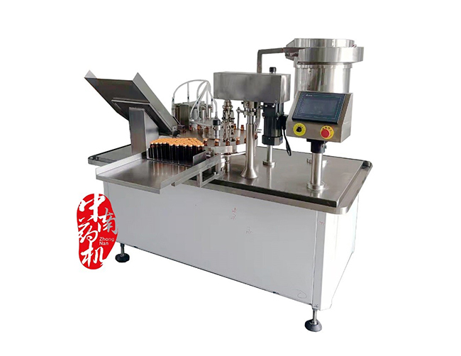 本機是口服液生產(chǎn)線中的灌裝主機,主要用于對10~20ml易拉蓋(或鋁塑蓋)直管瓶的灌裝、上蓋、封口。釆用螺桿進瓶,送瓶可靠,四頭局部跟蹤灌裝,不易產(chǎn)生泡沫;電磁振蕩送蓋,上蓋率高;三刀離心式軋蓋,軋口美觀。該機灌裝封口合二為一,結(jié)構(gòu)緊湊。