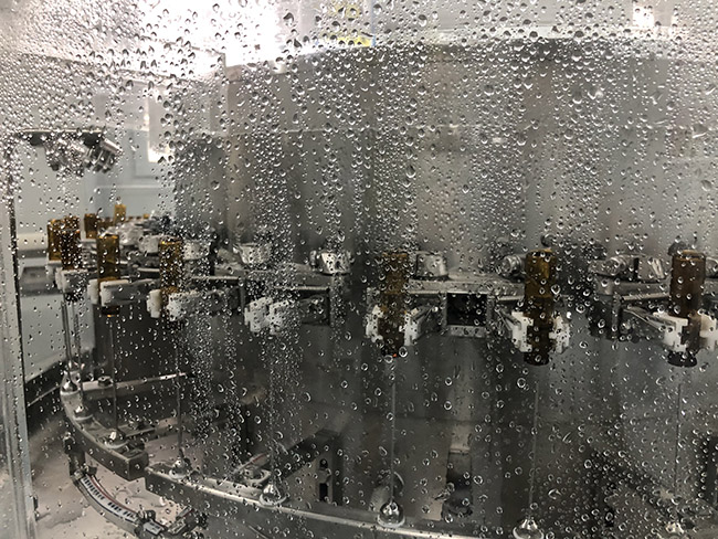 撥輪將瓶子自水中平穩(wěn)地提升并送至大轉(zhuǎn)鼓的機(jī)械手上。不銹鋼機(jī)械手將瓶子夾住并翻轉(zhuǎn)180度,使瓶口朝下,隨后依次經(jīng)過六個(gè)沖洗工位: